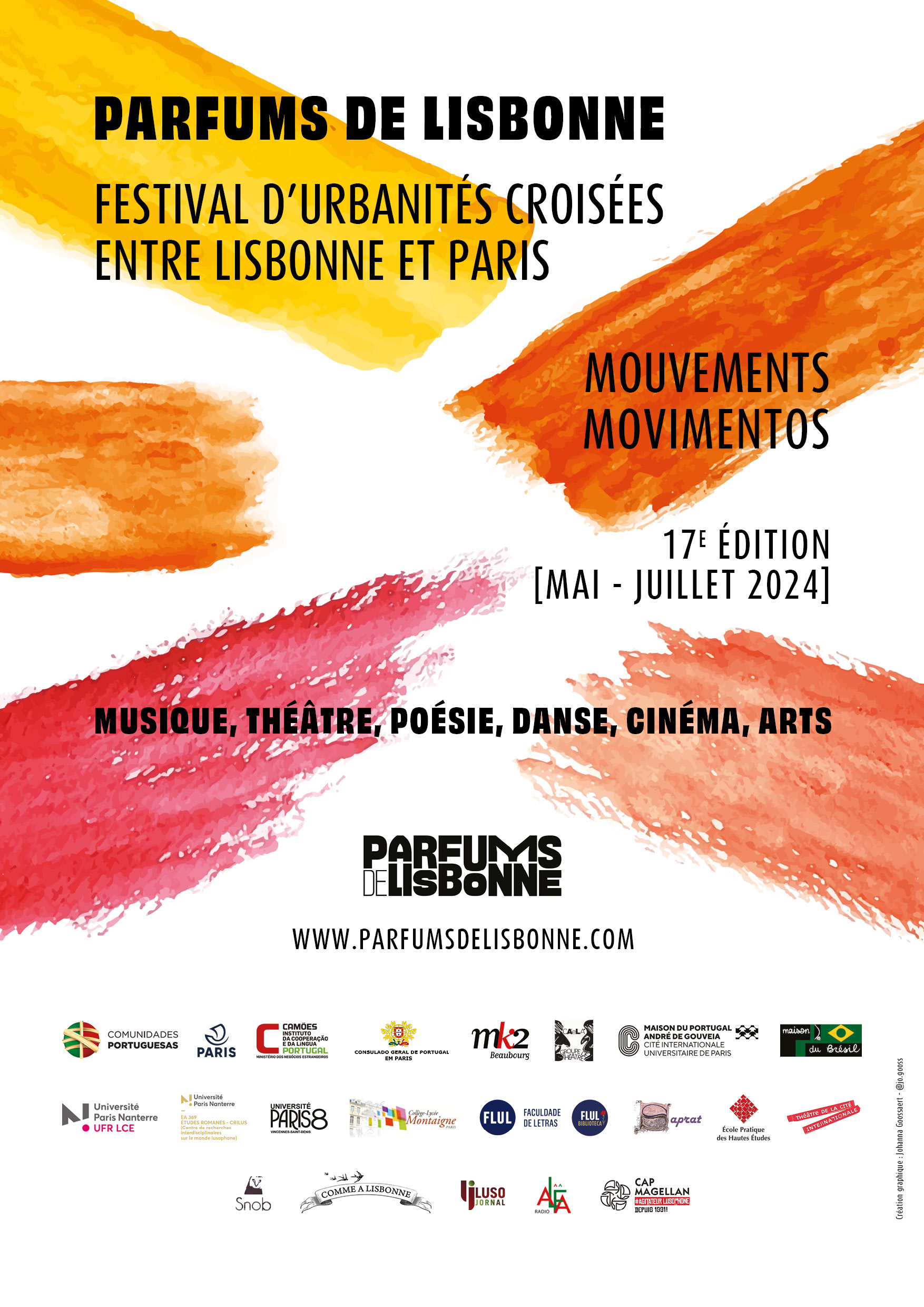 17e édition des Parfums de Lisbonne – Festival d’urbanités croisées entre Lisbonne et Paris. Ce festival est organisé par Cá e Lá (compagnie de théâtre bilingue français – portugais) sous la direction artistique et théâtrale du Centre de Recherches Interdisciplinaires sur le monde Lusophone (CRILUS - UR Etudes Romanes) de l'Université Paris Nanterre en collaboration et avec le soutien de nombreux partenaires. Cette année, le festival Parfums de Lisbonne a pour thème « Mouvements / Movimentos »