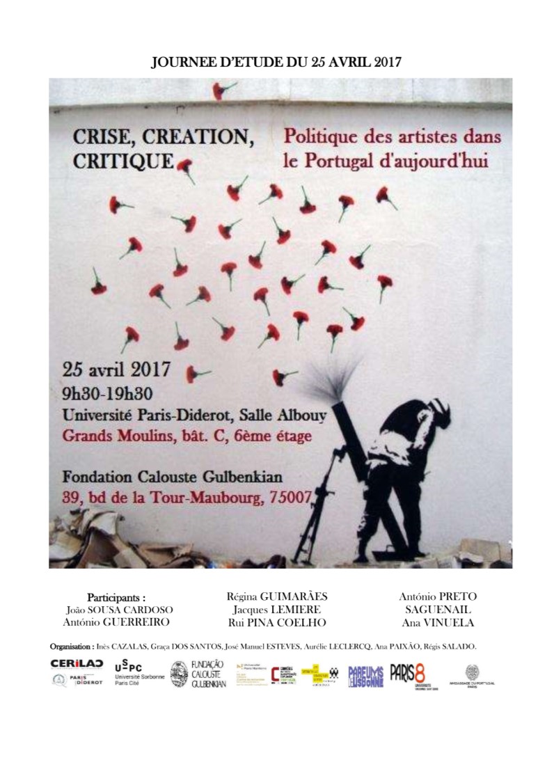 Organisée par le CRILUS (Centre de Recherches interdisciplinaires sur le monde LUSophone) - EA 369 Études Romanes, le CERILAC - Université Paris-Diderot et la Maison du Portugal - Université Paris 8, cette journée d'étude porte sur le thème "Crise, création, critique. Politique des artistes dans le Portugal d'aujourd'hui" (Arts du spectacle, cinéma, littérature)